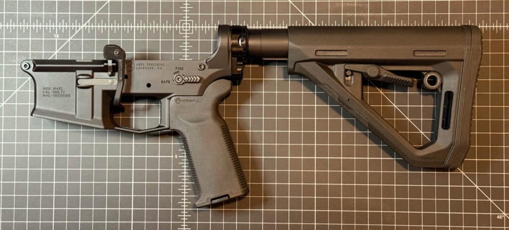 Nearing the end of my Aero Precision M4E1 lower receiver build—this one a “Low Profile” version with no overt Aero branding, just a blank starboard side and a small Aero Precision logo on the serialized port side—I decided to make a few small quality-of-life adjustments. (View the previous installment here.)