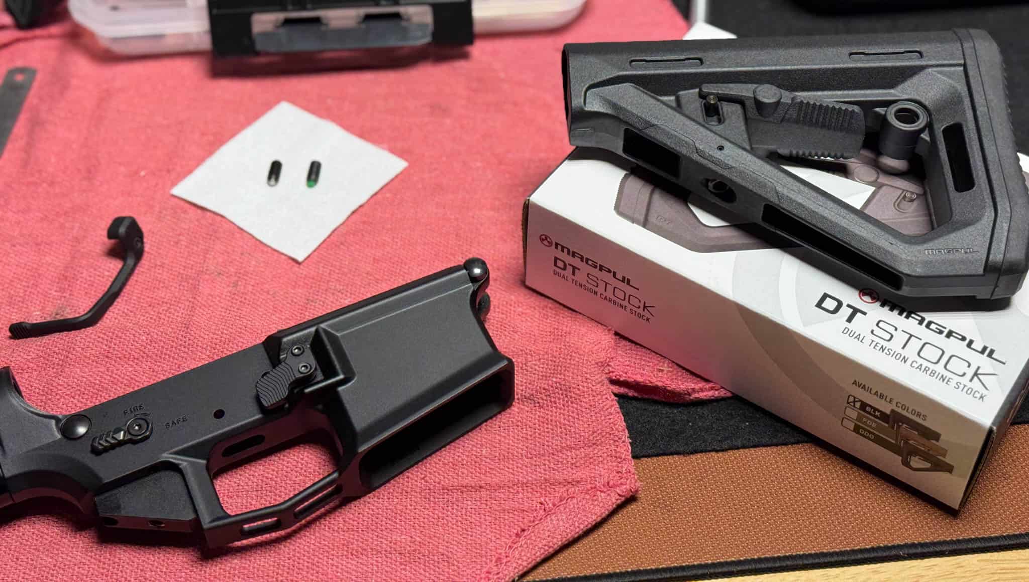 For the buttstock, I ordered a Magpul DT Carbine Stock, DT for “dual tension.” The DT stock features a minimalist A-frame look and, according to Magpul, was engineered to merge “the best features of the SL and CTR product lines with its new dual tensioning technology.”
