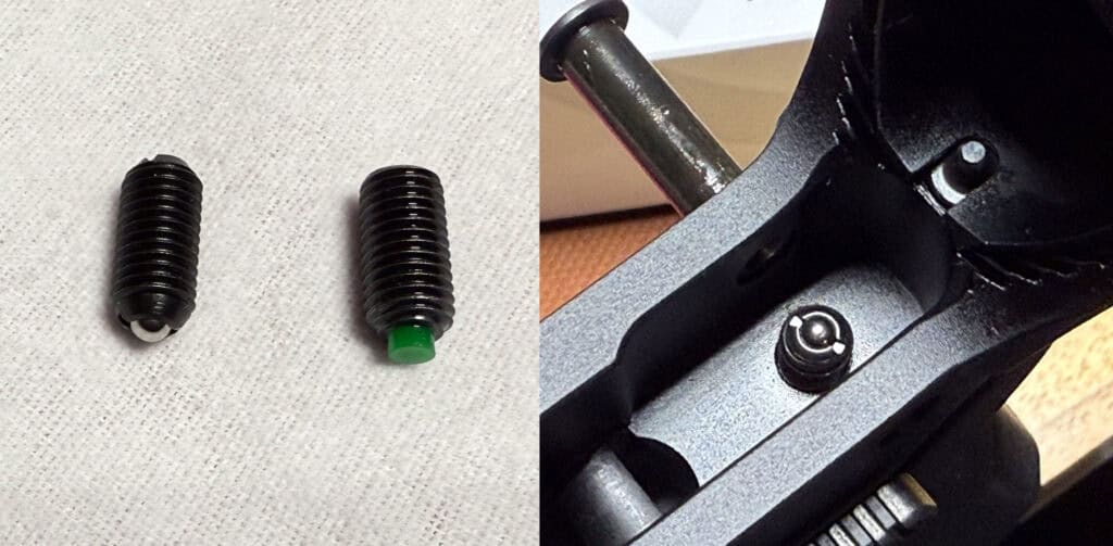 One day I ran across a Reddit post that suggested using a ball-nose spring plunger instead of the nylon-tipped screw. Using one of these, available here from McMaster-Carr, allows you to more easily fine-tune the fit and tension against the takedown pin.