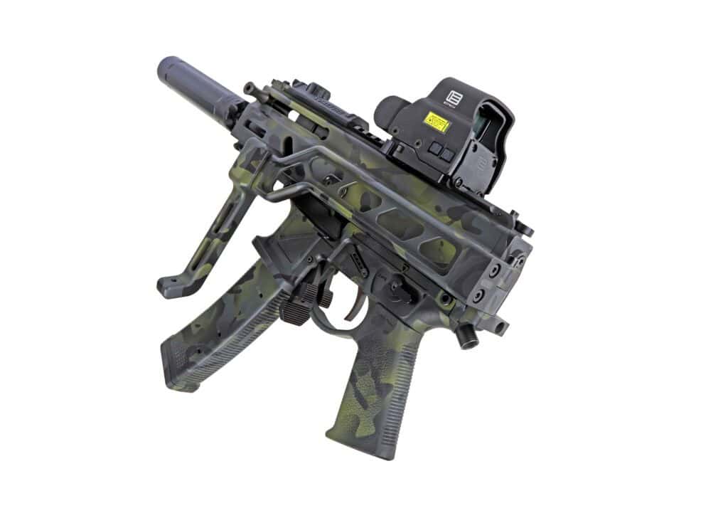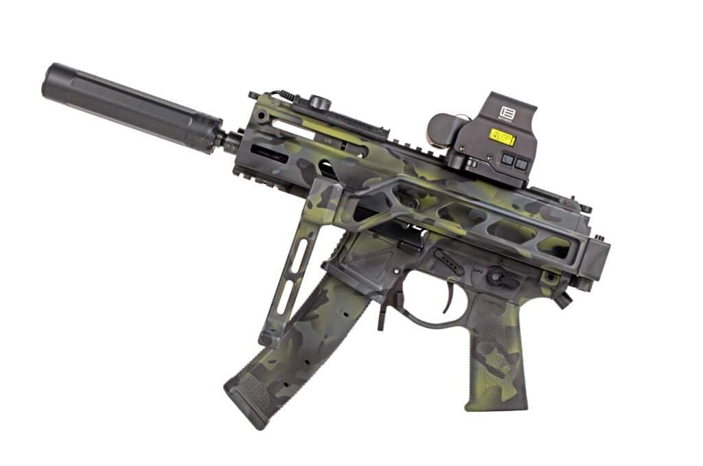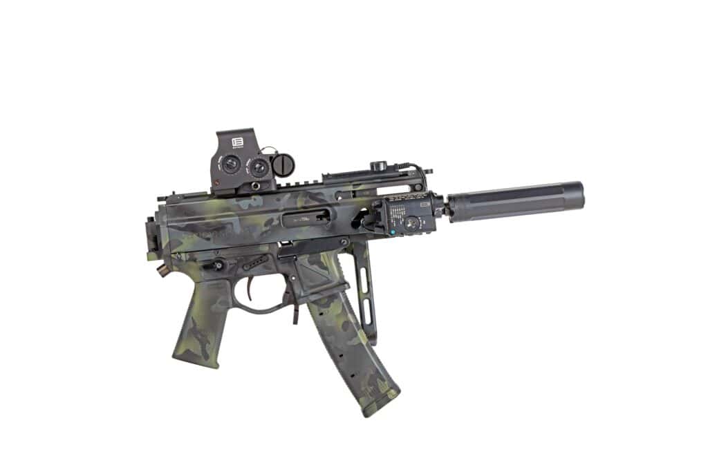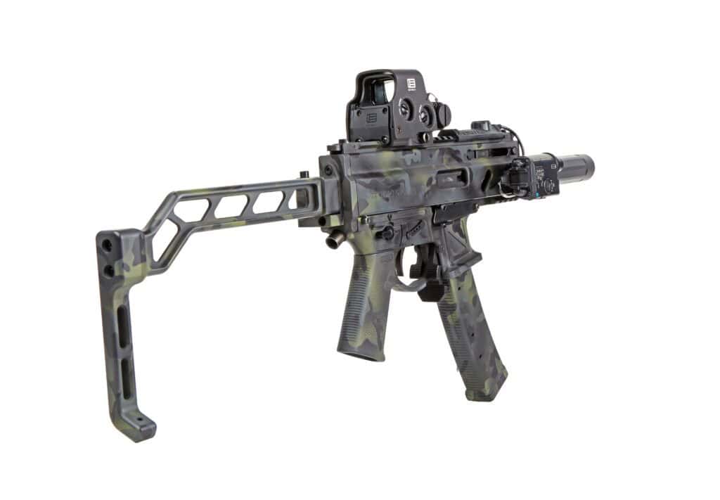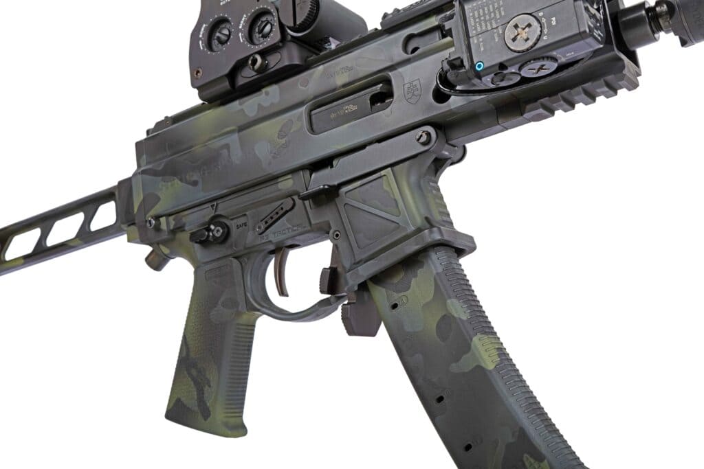 What once was an all-black Stribog came back with a really clean and muted MCB-style pattern applied to it with a slight hint of green tones mixed in. “I didn’t want it to be really flashy but to have a clean, blended look,” Tim says. It looks like Koted Arms definitely delivered. The finish is super-smooth with no indication of the masking used to create the pattern. The expert Cerakoter did a great job selecting the colors and blending it all together.