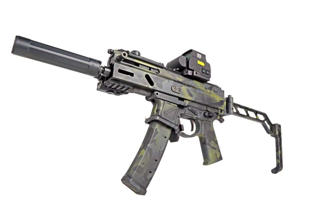 The Stribog’s barrel tip comes threaded with a 1/2×28 thread pitch, so it was easy for Tim to attach his SureFire Ryder 9mm suppressor. We asked him how he likes the Ryder suppressor. “I only have one 9mm suppressor, so it gets moved around a lot,” he replied. “This goes on everything from my CZ Scorpion to my Glock.
