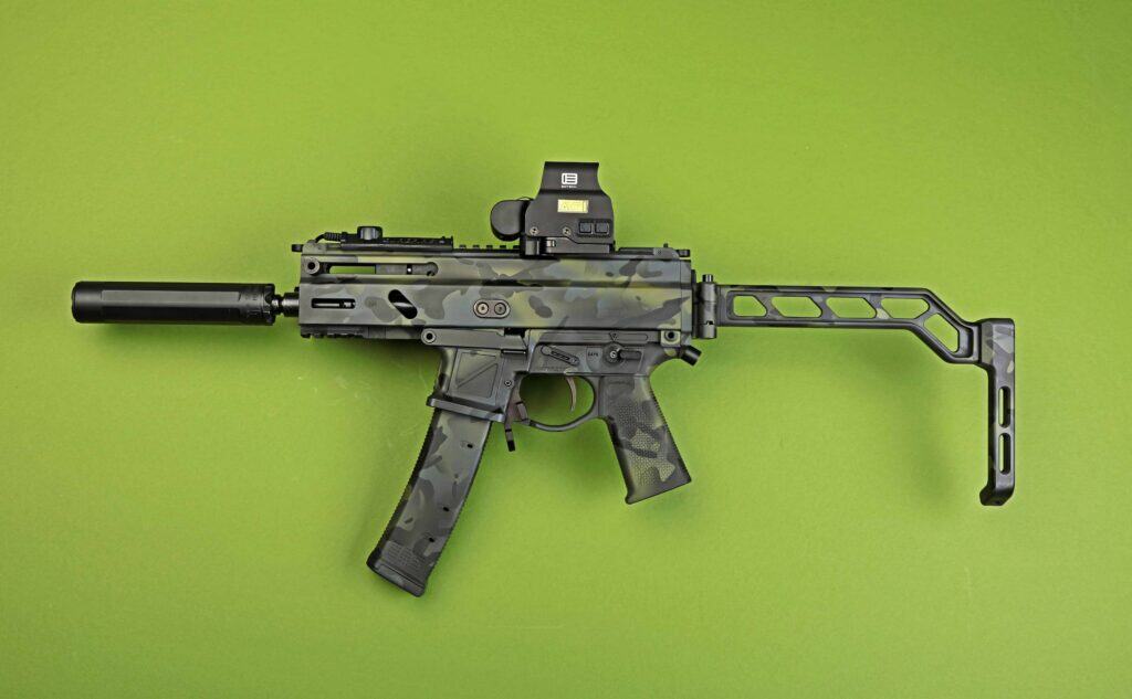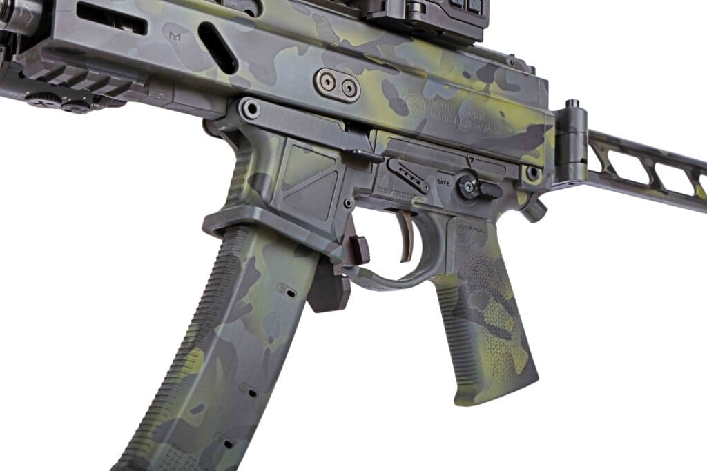 For Cerakote, Tim turned to Koted Arms in Mesa, Arizona. Regular UN12 readers should be acquainted with Koted Arms, as we have featured quite a few firearms that they’ve coated. Tim noticed as well and chose them to coat his Stribog based on projects he saw in the magazine. He sent them the Stribog and the A3 lower and pistol brace, as well as a magazine, and asked for them to coat it in a MultiCam Black-style (MCB) pattern.