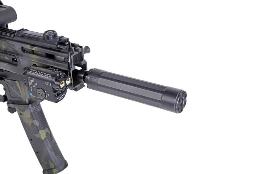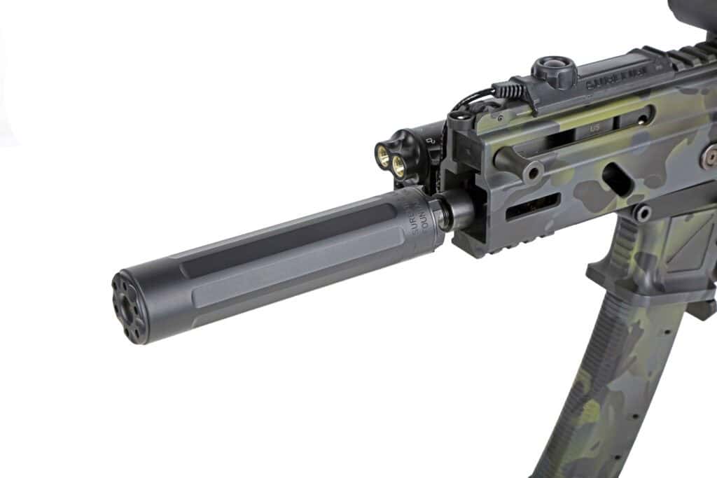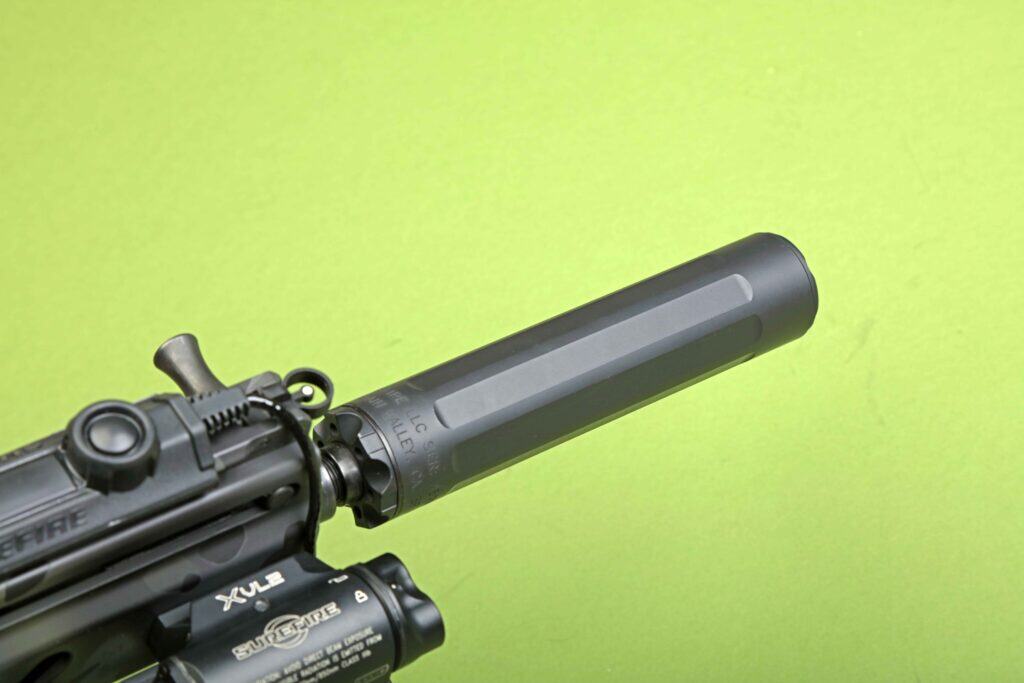 It is stupid quiet and really light.” Designed specifically for 9mm pistols and rifles, the SureFire Ryder 9M-Ti’s titanium exterior construction makes it ultra-lightweight and features durable, heat-treated stainless steel baffles inside that are indexed and numbered for easy disassembly, cleaning, and reassembly. Even cooler is that it’s modular for length. A 2-inch module can be removed from the front portion of the suppressor to reduce its overall size. The Ryder’s short configuration is shown here.