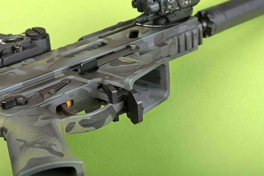 “There are replacement lowers that take Glock mags, but I already own a CZ Scorpion and have plenty of EVO mags available for it, so it worked out perfectly for me,” Tim says. He completed the lower using a Timney Triggers 3.5-pound drop-in trigger, Magpul MOE K grip, and a Blitzkrieg Tactical ambi safety selector. Each of these parts helps increase the performance and comfort when handling and shooting the Stribog.