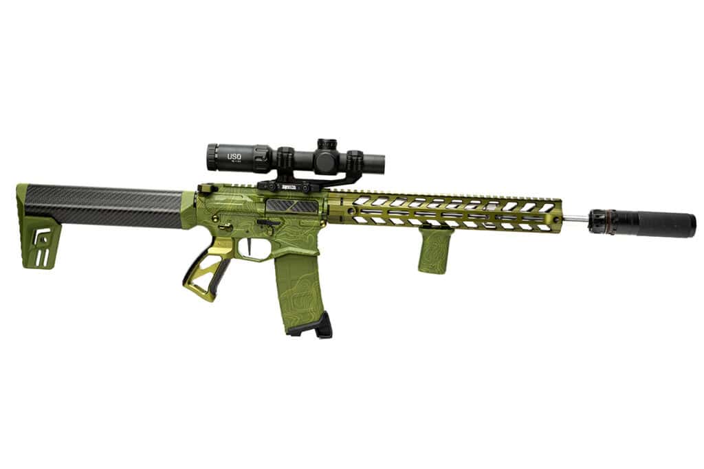 To continue the green and carbon fiber theme, a Fortis MFG Torque pistol grip with OD green carbon fiber was used. This billet grip features a reduced angle that provides a comfortable grip and improved trigger reach.