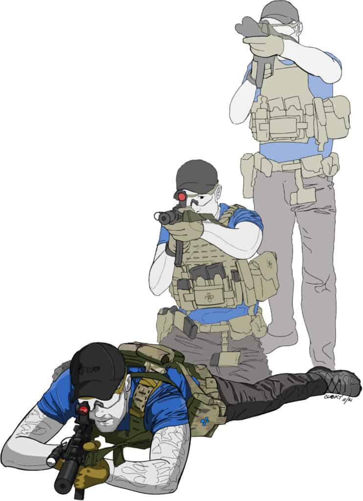 Pro Tip – Monica, also known as double kneeling to the church going crowd is almost universally the answer here. I have seen shooters use braced or speed kneeling effectively, but not many. The capability of the Monica position is that nothing has changed from your waist up from when you are shooting standing. So it goes to reason that if you can deliver rapid accurate rounds from standing, then no need to change anything at all besides dropping down to both knees and doing it again. It also has the bonus of keeping your support equipment (magazines, pistol, med kits) all in the same orientation respective to your arms and torso as the standing position so any skills you have developed manipulating those things will still be present with no movement modifications needed at all. Both of these things equate to efficiency, which is in dire need here.
