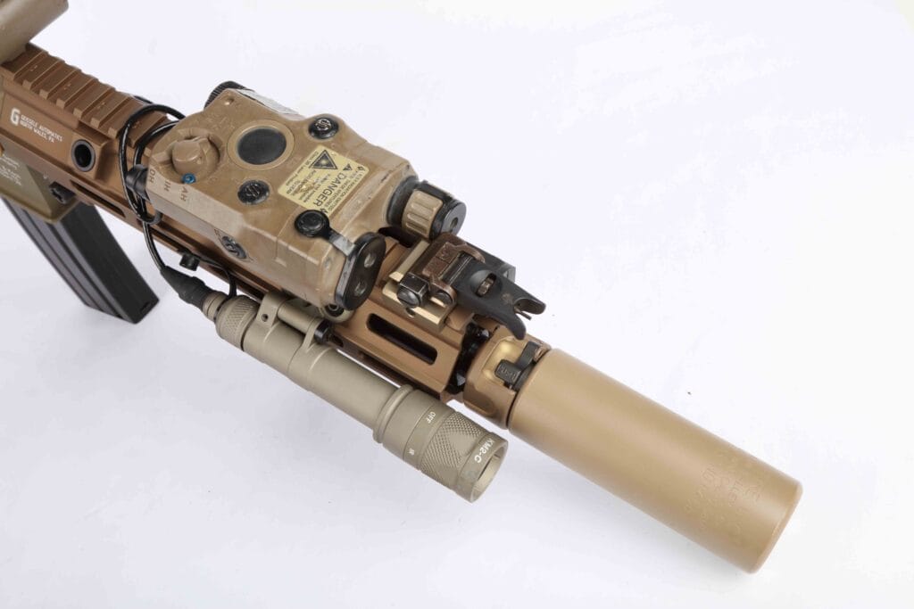 The build also includes Knight’s Armament Folding Micro Sights on both the front and rear, which provide reliable sighting options. Additionally, a SureFire FH556-212A flash hider and a SureFire SOCOM556-MINI2 suppressor have been added, lending the gun a more tactical appearance and improved performance in the field.