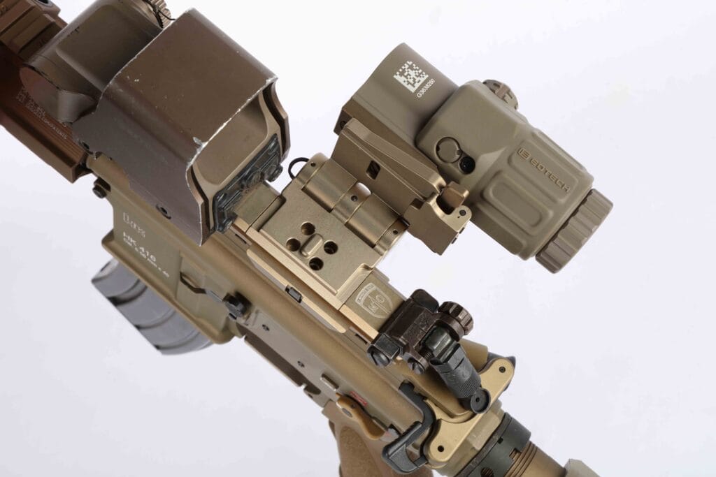 To complete the build, Richard added a range of accessories that further enhance both performance and aesthetics. The Wilcox 1 Minute Out flip-to-side scope mount not only served as the starting point for the project, but now holds an EOTech XPS3-0 scope. Complementing the scope is a tan EOTech G33 magnifier, which provides additional versatility in target acquisition.