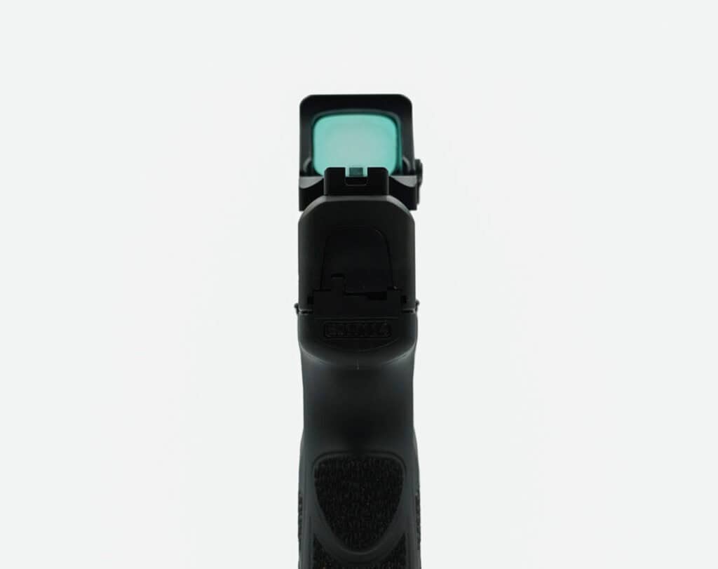 The Minimalist OR design is simple but effective, with a self-illuminating tritium tac lamp in the front sight and a non-tritium, blacked-out rear that’s designed to drive focus to the front. Both the front and rear sights are serrated to eliminate glare, and the rear sight ledge allows for one-handed racking of the slide.